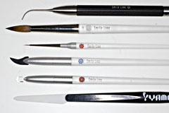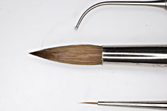 陶材築盛用の器材です 上からオペークアルミナボール小 クリアーハンドルブラシ8番ビッグ クリアーハンドルブラシ0番 クリアーハンドルブレードソー クリアーハンドルブレードホロー ゼオセライトセラミックスパチュラ です 山本貴金属株式会社扱いのスイス SmileLine社製のものです ほぼこれの8番で盛ってます 良く技工の本では太い筆ですべてやってる技工士先生のハナシが載ってますが これを使うまでは「変なこと言ってるなぁ」くらいにしか思ってなかったんです この筆は水を含ませると先が非常にシャープにまとまります で、ビーズ大くらいまでの陶材をすくってくることが出来るわけです すると太いだけあってコシがあるので、先っぽであってもちゃんと持ってこれる 使いやすいわけです さすがコリンスキー 筆の細いのはステイン用です ま、あんまりほかの筆で使い込んでないんですが、以前使ってたそれなりにする筆より 全然良いので、ご紹介します 一番上のオペークアルミナボール小はオペーク塗るときに使うモノで オペークにカラーオペークを混ぜるとき良い感じです ブレードソーは、筆に合わせて買ってみただけで、柄の部分がかっこいいなぁ、、 というくらいです 刃がすごく薄いので落っことすと大体曲がってしまいます、 あとポーセレン用のスパチュラ これは山本貴金属株式会社本体が製造してる ジルコニアのものです 陶材パレットとして瑪瑙板を使っているのですが それと合わせると、非常に堅いのが体感できます 陶材を練るときガラス練板を使うと、陶材のガラス粒子が練板のガラスを巻き込んでしまう それを防止してくれます、ということなんですが 感触が良いので 気に入ってます また裏が計量カップになってるので陶材を1:2で混ぜる、とかそーゆー用途にいいです |