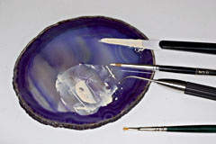 これメノウ板です メノウ(瑪瑙、agate、アゲート)は縞状の玉髄の一種で、蛋白石、石英、玉髄が層状に岩石の空洞中に沈殿してできた鉱物の変種である。中心部にすき間を残していることがしばしばあり、まれに液体・気体がそのすき間に存在することもある。 主成分はSiO2。比重は2.62-2.64、モース硬度は6.5-7。隠微晶質であるため肉眼では結晶を認めることができず、非晶質のように見える。 多孔質であるため、人工的に染色が可能である。 と、Wikipediaに書いてあります ガラスはモース硬度が5-6ですから ガラスより硬いんですね でこの硬さは陶材を練るのに良いんです 陶材を練るってことはガラスの粉を練ってるのと変わらないので、同じくらいの硬さのもので練るのでは表面が 削れて混入してしまいます すると陶材はその後900度くらいで焼きますんで その時の発色が変わってしまいます これとジルコニアのヘラで練ると その硬さがよく分かります 一番上の写真はストロボで撮ってます で2番目の写真はストロボ無しです すこし透明感があって綺麗です 長径10cm短径9cmくらいです、オペークを塗るくらいならちょうど良い大きさです ボディ陶材とかは4-5種類くらいで手狭になる大きさです あと、赤いのも使ってたんですがちょっと染料がにじんでくるので使えませんでした |