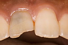 レジン部に極力熱が行かないように手早く レジン部に濡れたティッシュを巻いておくのも良いかも 冷や汗が出る瞬間です 鑞の流れに無理があるのですこし巣が入ってしまった | 鑞の流れを考えると 今回のような重ね継ぎ手はあまり良くないが 強度を考えると致し方ない スカーフ継ぎ手とするのも一考の余地がある 維持部に歯冠用コンポジットレジンで歯冠を築盛して修理完了 |