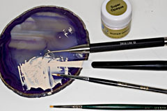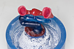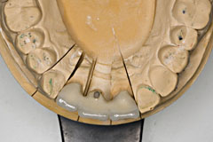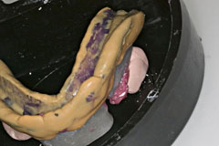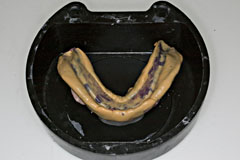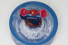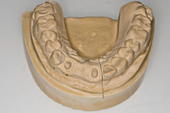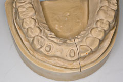 ここに普通石膏を流し込み 硬化前に面をならします これはいつも義歯重合をやっていれば慣れてる作業です | で、トンカチで、、 |