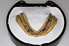 個人トレー・イソコンパウンド・GCフュージョン2extraWash 印象を採ったは良いが模型を起こすのが一苦労 で 義歯重合用のフラスコにワセリンを塗りたくります | 印象面が極度に傾かないようにフィンガーレスト部に マルチパットで底上げしています |
