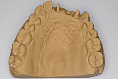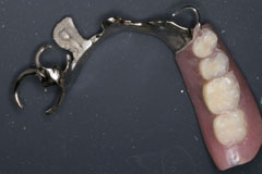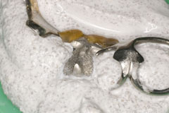 テトラサイクリンによる着色歯の症例はかなり減少している、審美障害の改善ケースが多い | Reduction量は0.5-0.7mm 切縁は0.5-1.0mm落とす コンタクト前で形成を止める もしくはコンタクトを完全に落とす、中途半端だと耐火模型が作れない(その時は分割耐火模型が作れないので、分割無しで作る→隣接面の形態は削り出し) 耐火模型はメタルより熱伝導率が低いので、炉内焼成時に耐火模型に熱カロリーを持って行かれる、よって昇温レートを45℃/minに下げじっくり焼きあげる。 減圧温度はガラス溶融点の600℃以下であればよい、大気圧下で550℃くらいまで昇温しておいて不要な有機物をとばすようにする、よって減圧開始は520℃から550℃くらいに設定する ウォッシュベークをすることにより、耐火模型からの陶材の引かれを防ぐ、ウォッシュはごくごく薄く マージンに1mm程T-Glassすることによりレンズエフェクトで仕上げることが出来る 耐火模型はノリベスト、焼成ピンはGCのセラミックピン 築盛はごくごく普通、耐火模型の製作の方が工程が複雑 ビビデント(ビバデント??)のポーセレンポイントが有用 マージン出しはホワイトポイント とまぁ、こんな感じの講習会でした、意味不明な文字列ばかりですね、まぁ結構大変なんですよ作るのって キャストリンガルバー義歯の増歯 キャストリンガルバーを使った義歯では増歯することが出来ず、再製作を余儀なくされることが多かったのですが 増歯部分を鋳造で製作して、局所的に鑞着することにより修理できたのでご報告 ちなみに今回修理にかかったチェアタイムはちょうど1時間程度であった 口腔内写真を撮っていなかったので模型ですが |