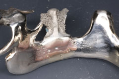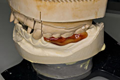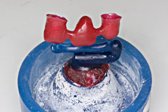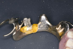 口腔内でリンガルバーとパーツの位置を確定してパターンレジンで仮固定 これにより粘膜面のメタルタッチを実現している 即硬性の鑞着用埋没材で固定 | 鑞着面にフラックスを忘れずに 銀鑞を流して鑞着 |
