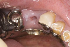 左下4が歯根破折で抜歯と相成り候 キャストのリンガルバーだとココに歯を足すことが出来ないので、他の場所は問題ないのに再製作 となることがあったのだが、今回鑞着で解決を図る 抜歯して3週間 | 大分創もふさがったので印象しました この時キャストのリンガルバーをタービンで段差が付くように削りこんでおきます 口腔内ではこんな感じ |